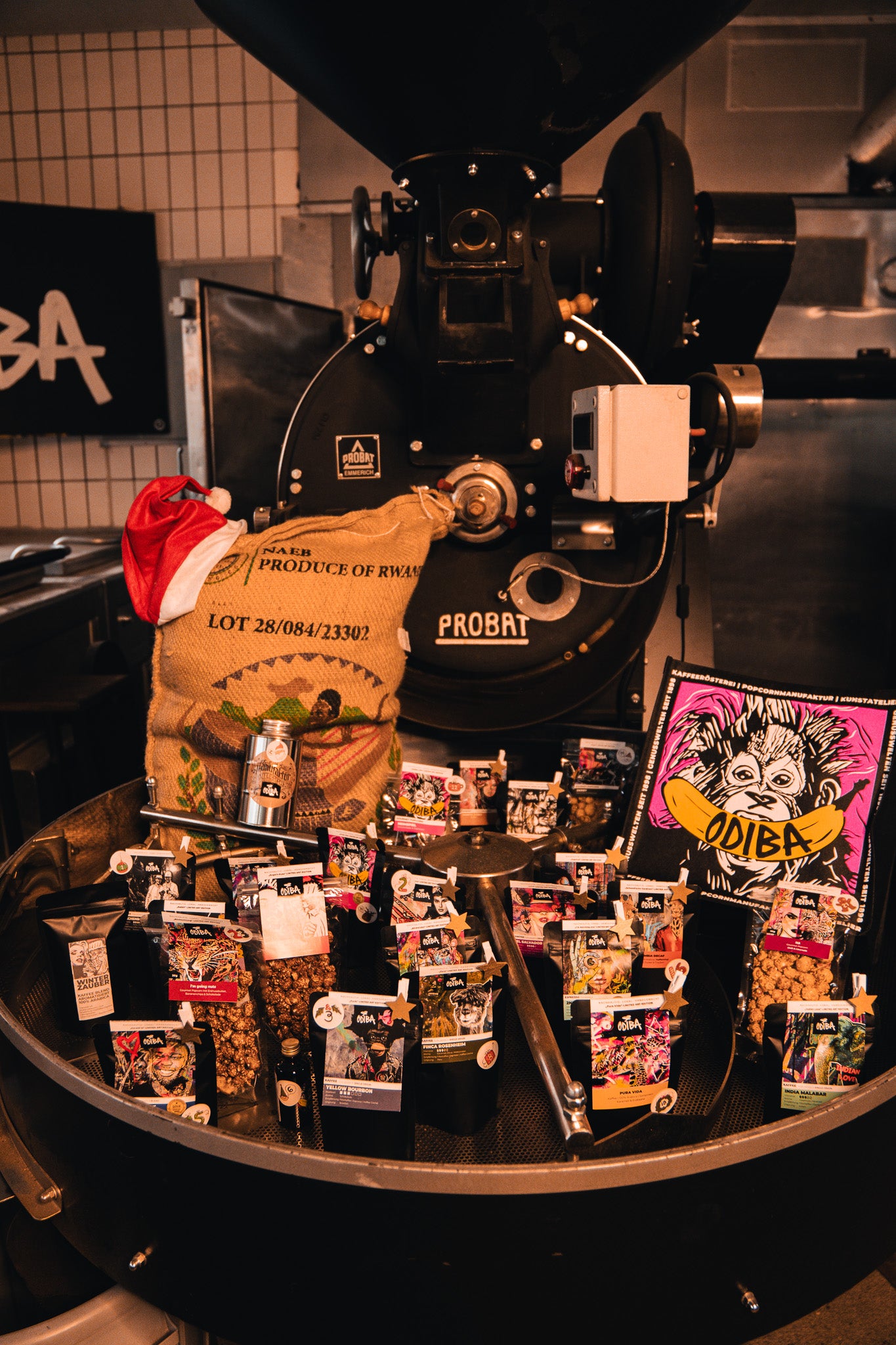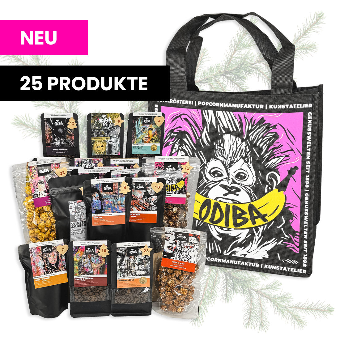 Ein Adventskalender für Genießer: Handgeröstete Kaffees, feines Gourmet-Popcorn, edler Kaffeelikör und eine hochwertige Jute-Tasche mit ODIBA-Logo – liebevoll zusammengestellt in unserer Rösterei und Manufaktur in Gelsenkirchen.
