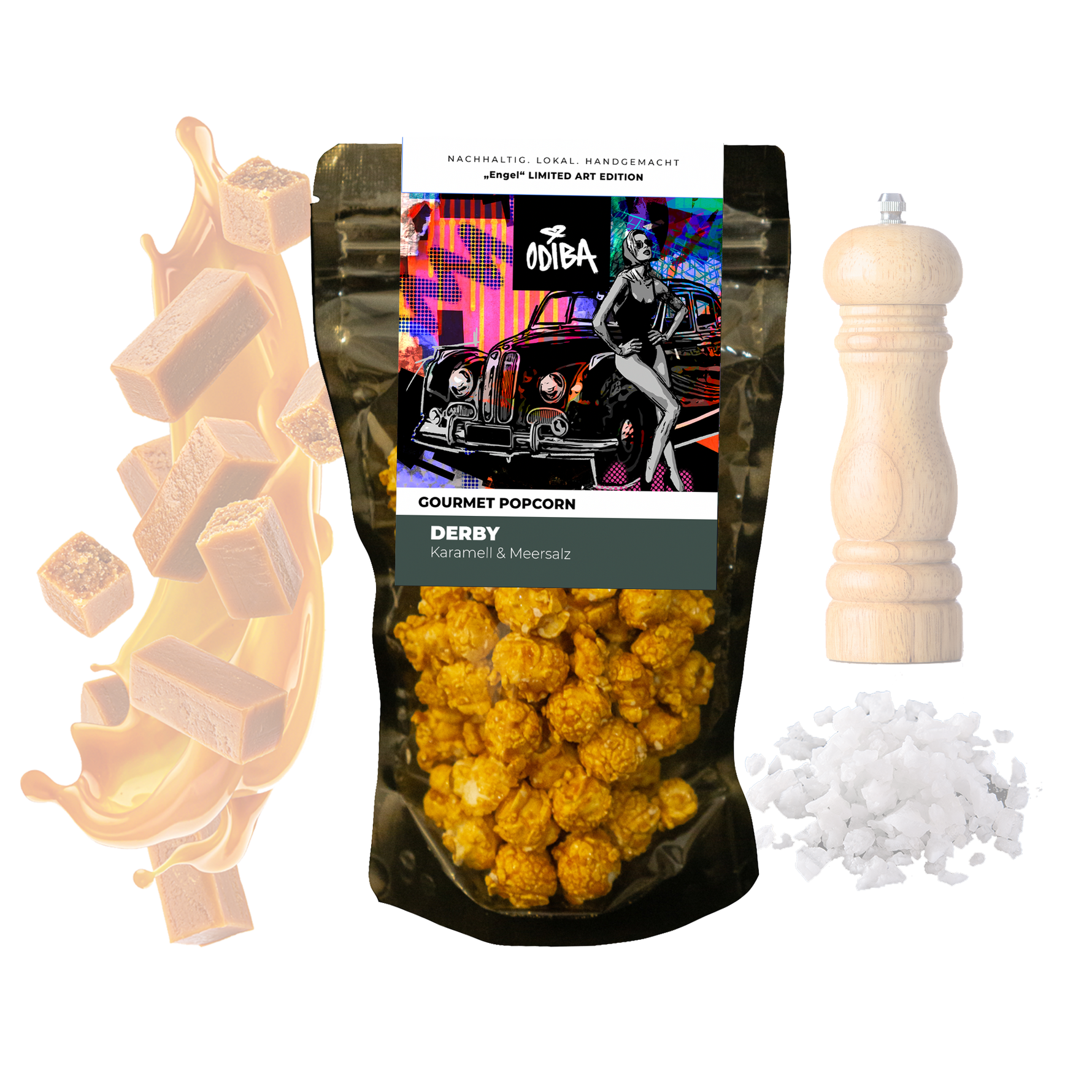 Das markante Motiv unseres beliebten Popcorns Derby ist jetzt auch als hochwertiger Kunstdruck erhältlich. Der „Barockengel“ stammt – wie alle ODIBA Etiketten – aus der Hand von Josef Bathen und vereint klassische Bildsprache mit modernen, grafischen Elementen.