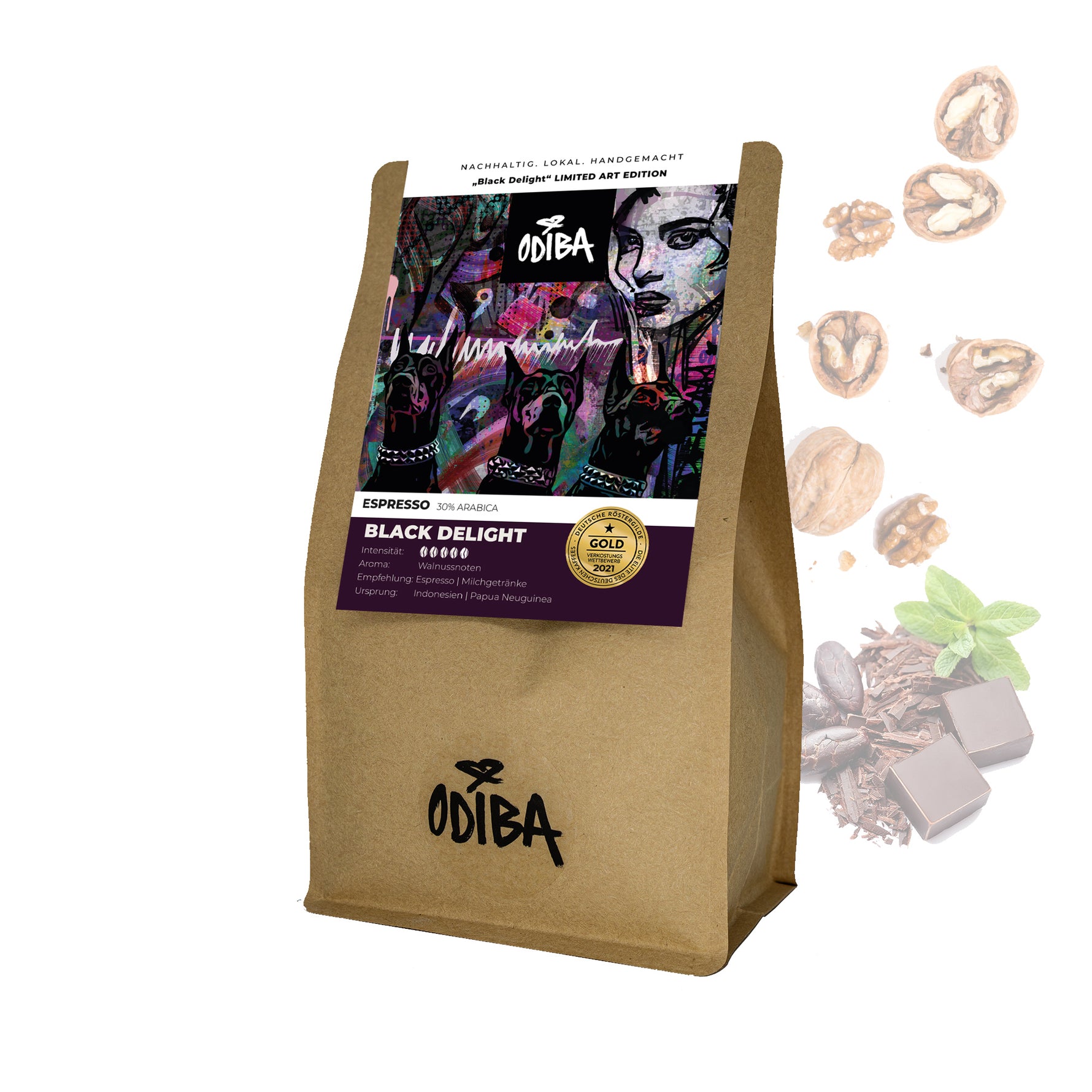 "BLACK DELIGHT" – Der Espresso Blend mit einer GOLD Auszeichnung von ODIBA entführt dich auf eine aromatische Reise durch Asien. Die harmonische Mischung aus 30% Arabica und 70% Robusta begeistert mit den erlesenen Aromen von Walnuss und Schokolade. Der mittelkräftige Röstgrad betont die sanfte und dennoch kräftige Note dieses einzigartigen Espressos. Perfekt geeignet für intensive Espressi oder als Basis für cremigen Cappuccino und verführerischen Latte Macchiato. Genieße die Magie von "BLACK DELIGHT" – ein Espresso, der höchsten Kaffeegenuss verspricht.