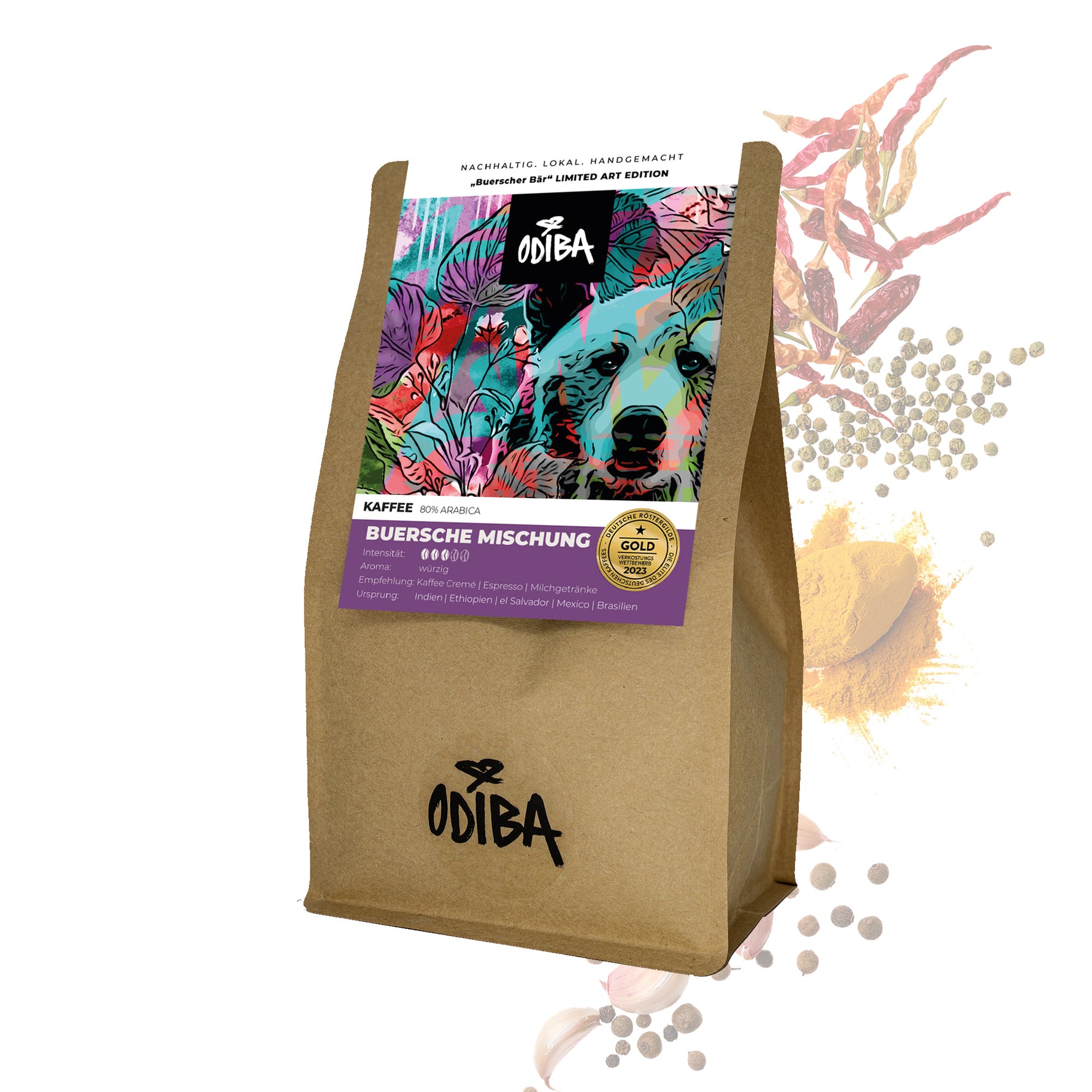 Unsere „Buersche Mischung“ – Ein Kaffeeerlebnis der Extraklasse! Unser mittelkräftiger Blend aus 80% Arabica-Bohnen vereint das Beste aus fünf Ländern – Indien, Äthiopien, El Salvador, Mexiko und Brasilien. Durch eine sorgfältige Trommelröstung entfaltet er herrliche Kakao- und Nussnoten mit einer leichten Würze.