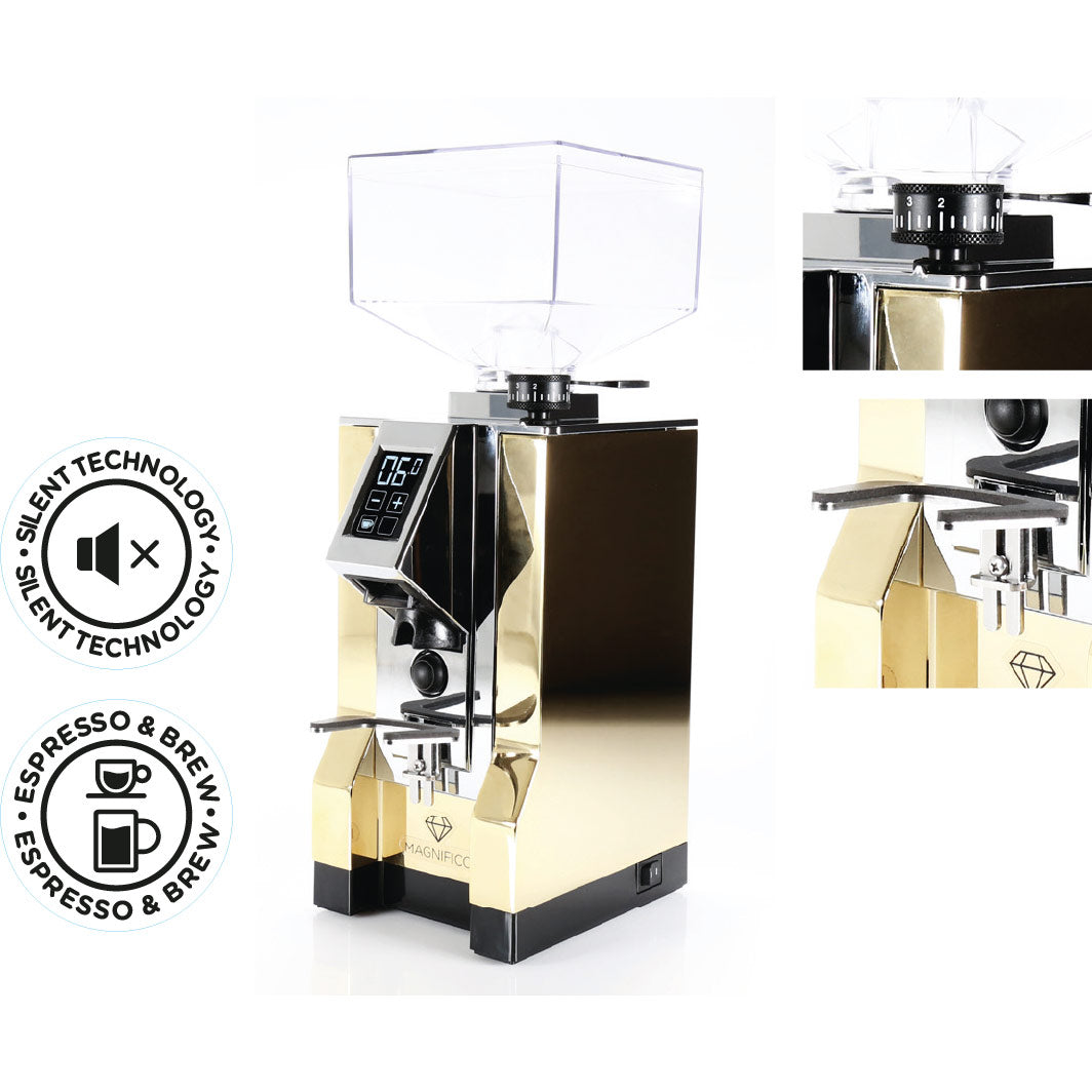 Die EUREKA MIGNON MAGNIFICO ist die Top- Mignon, die exklusiv nur von Fachhändlern des Espresso Partner Pool Netzwerks angeboten wird. Das Scheibenmahlwerk ist mit einer patentierten 55 mm Diamond Inside Hochleistungsmahlscheibe bestückt, die eine höhere Produktivität und Haltbarkeit aufweist als Standardmahlscheiben und dazu noch eine gleichmäßigere Granulometrie über die Nutzungszeit gewährleistet. Über das Touch-Display können zwei unterschiedliche Portioniereinstellungen programmiert werden und einen manuellen Modus gibt es auch. Die mikrometrische Mahlgradeinstellung erfolgt stufenlos über das angenehm große Drehrad. Natürlich verfügt sie auch über die ACE Technologie, gegen Verklumpen und elektrostatische Aufladung des Mahlguts. Die EUREKA MIGNON MAGNIFICO ist die ideale Kaffeemühle für den anspruchsvollen Home Barista. – leise, schnell, genau und unglaublich produktiv.