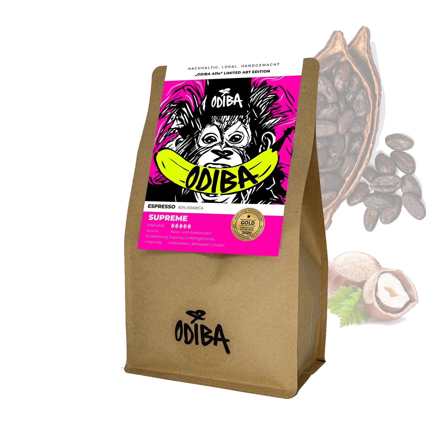 Entdecke mit "Supreme" Espresso das Beste aus der Kaffeewelt – ein GOLD prämierter Favorit von unserem Röstmeister. Diese einzigartige Mischung aus 60% Arabica und 40% Robusta verwöhnt deine Sinne mit einem Schoko-Nuss Charakter und einer leicht fruchtigen Note im Abgang. Perfekt als kräftiger Espresso, aber auch mit Milch ein Genuss. Von Hand gepflückt, nass aufbereitet und sonnengetrocknet – "Supreme" ist mehr als ein Espresso, es ist ein Meisterwerk des Kaffeegenusses.
